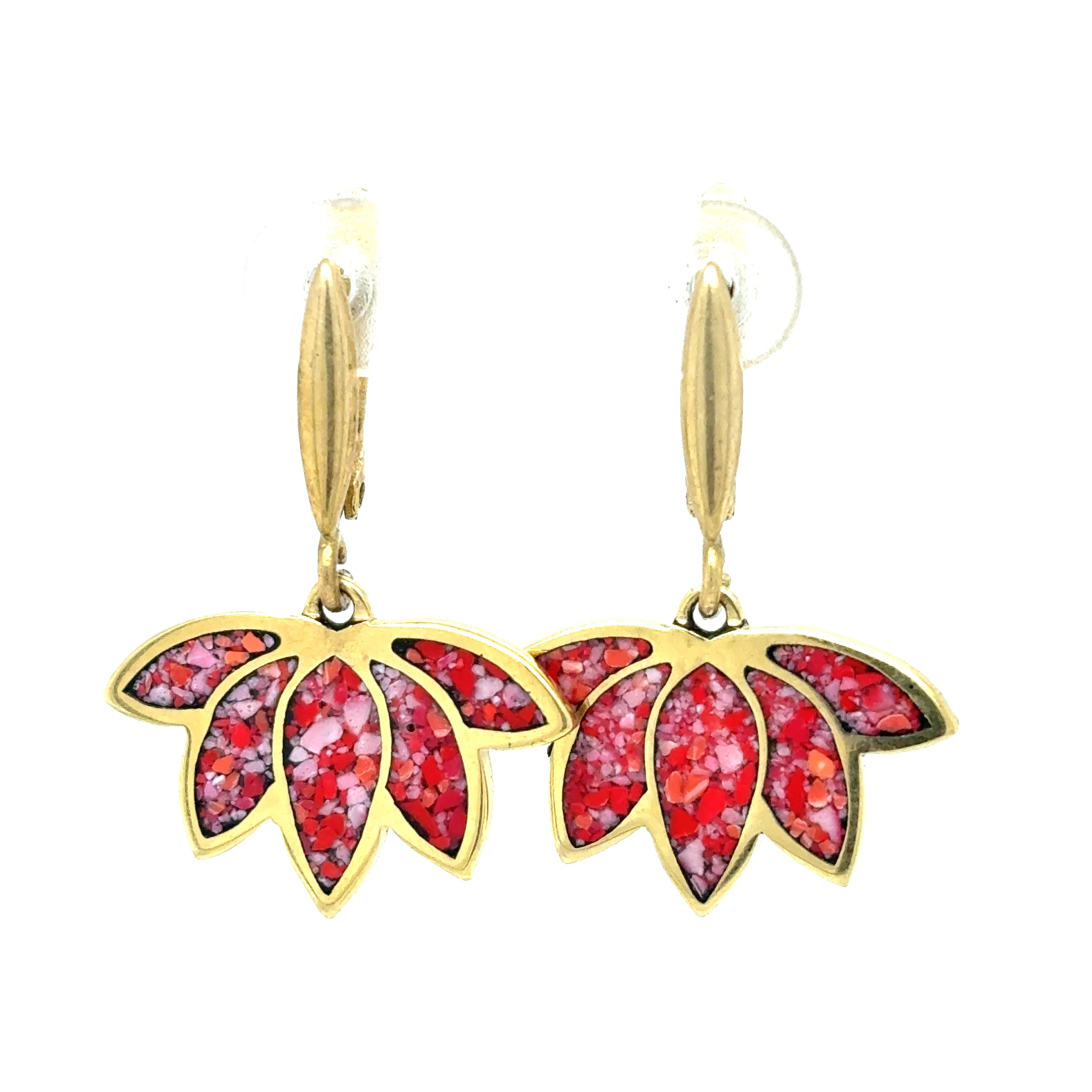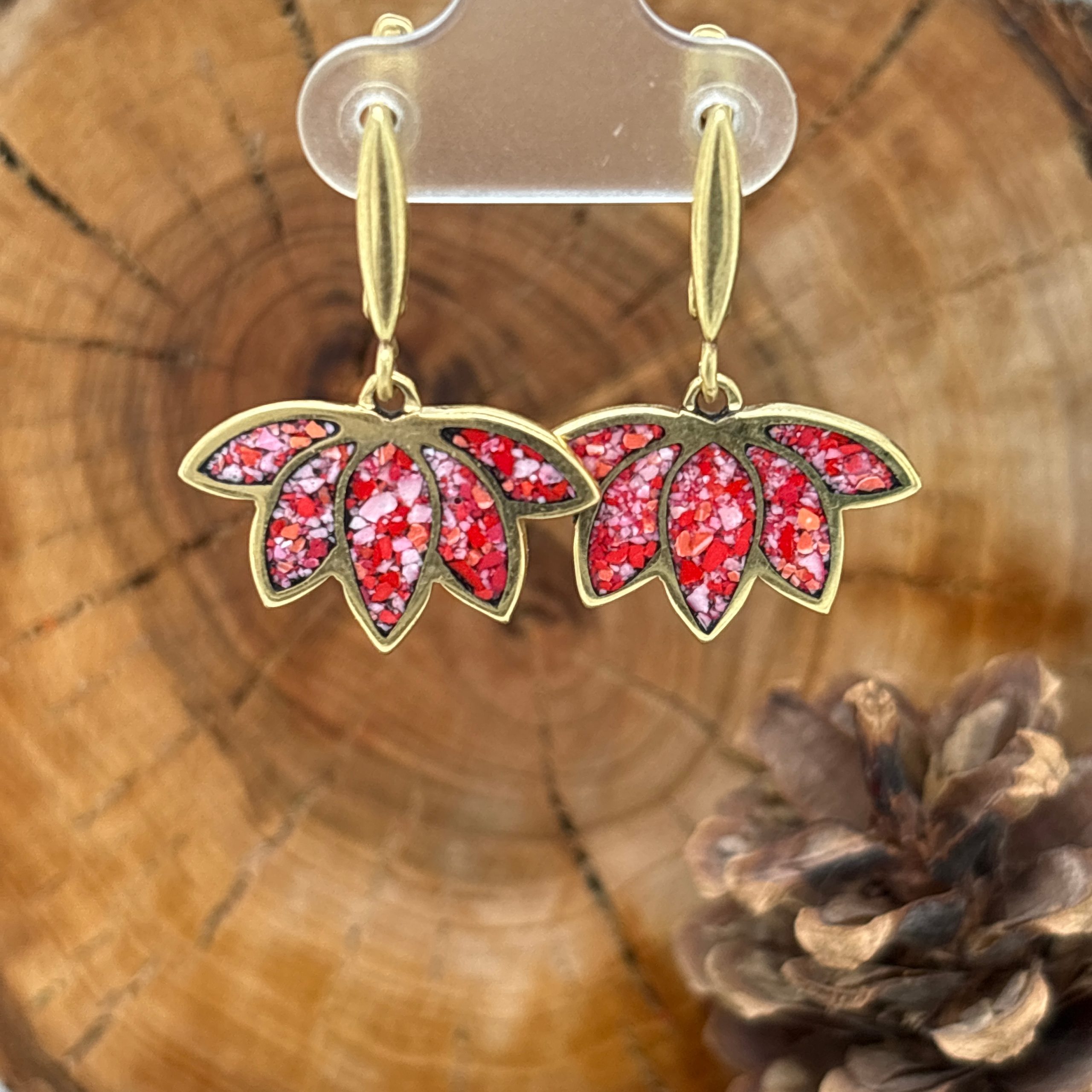 Elevate your look with these handcrafted drop earrings, featuring a vibrant pink and white turquoise micro mosaic inlay set within a graceful brass lotus-shaped frame. The solid brass design outlines the mosaic, depicting an elegant floral motif, creating a beautiful interplay of color and texture.