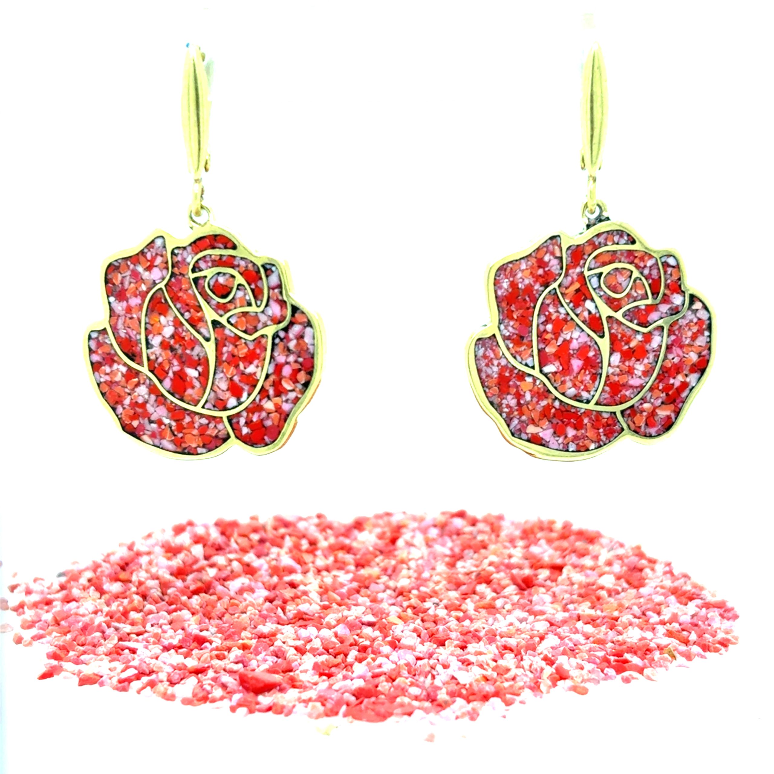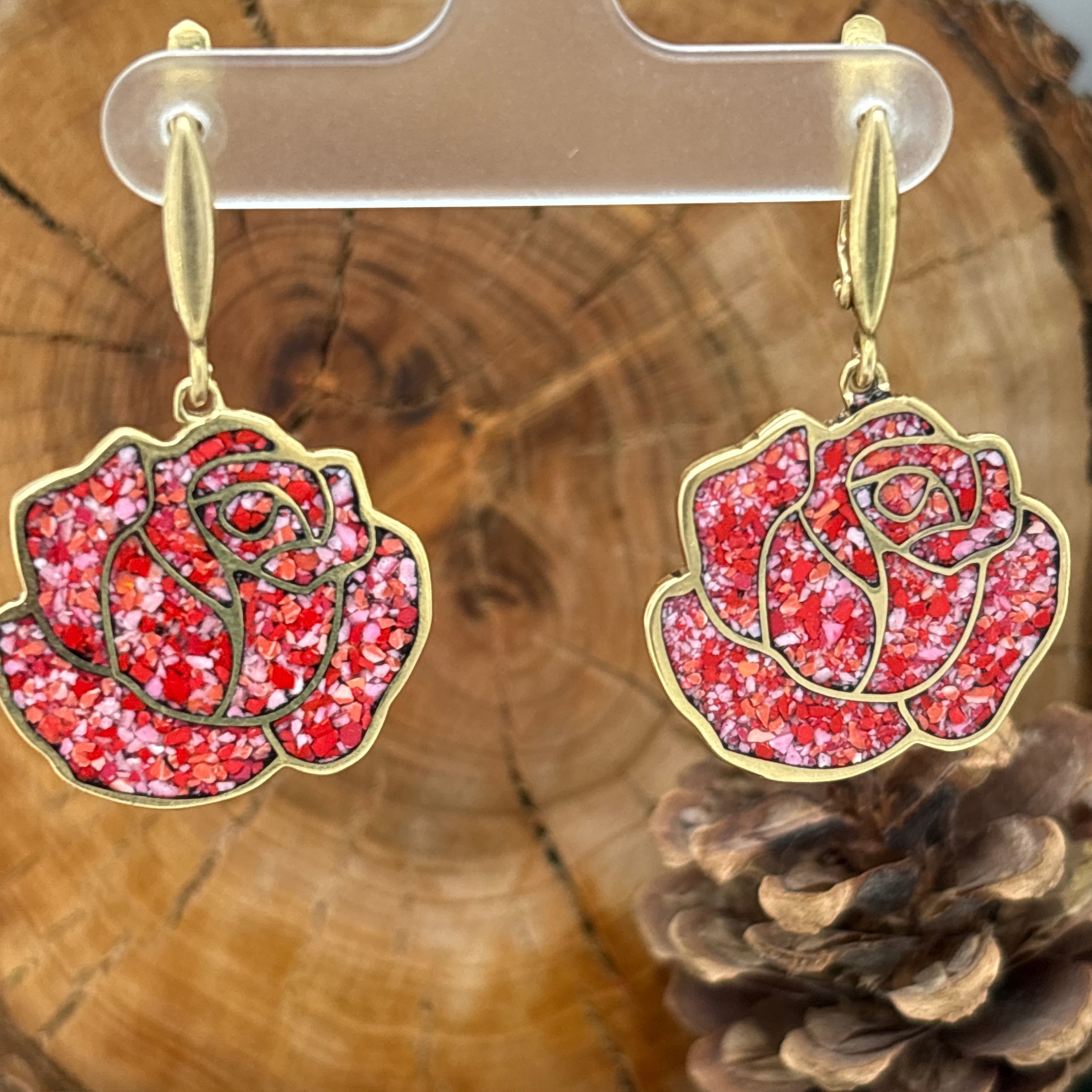 Elevate your look with these handcrafted drop earrings, featuring a vibrant pink and red turquoise micro mosaic inlay set within a graceful brass rose-shaped frame. Delicate brass filigree detailing overlays the mosaic, depicting elegant scrollwork, creating a romantic interplay of color and texture.