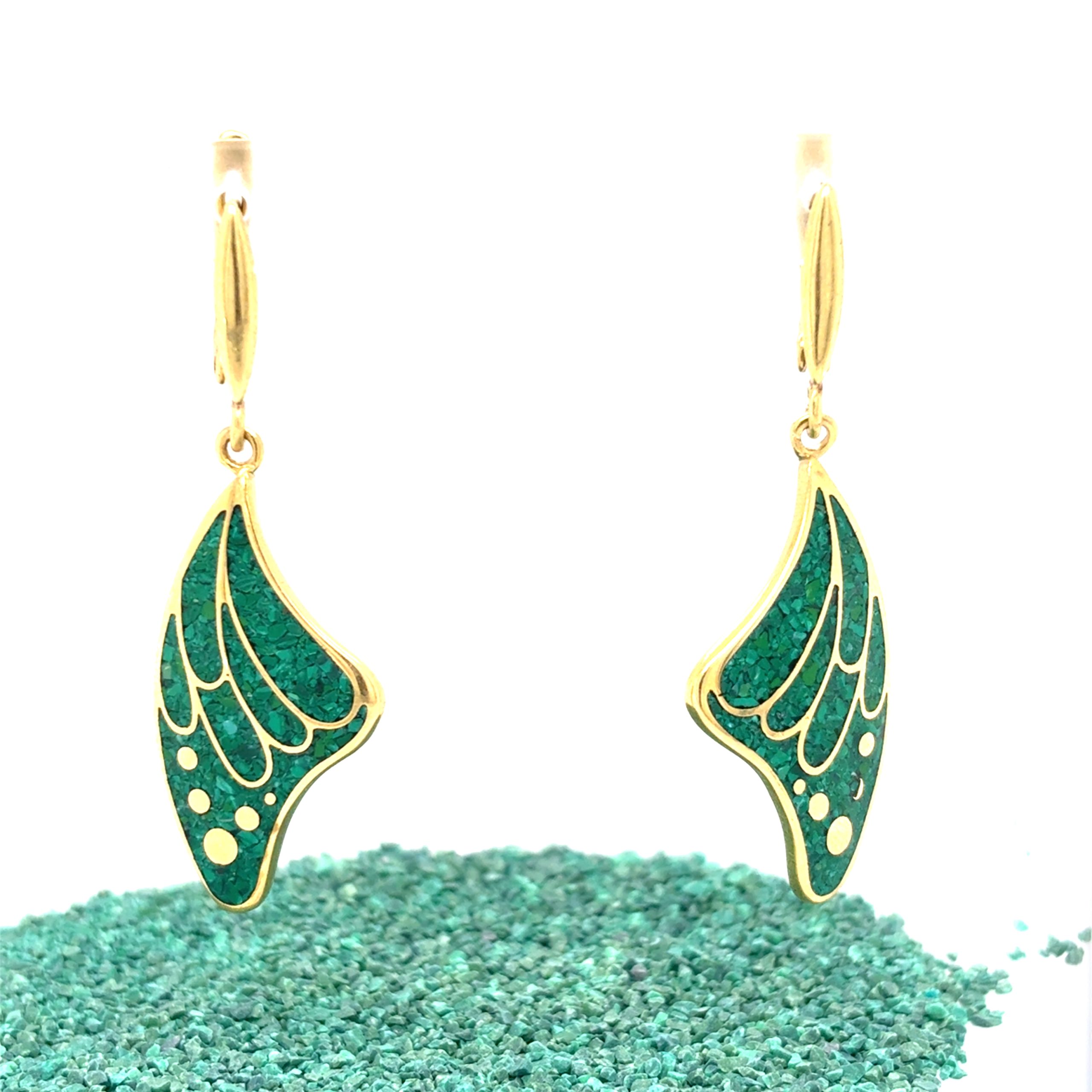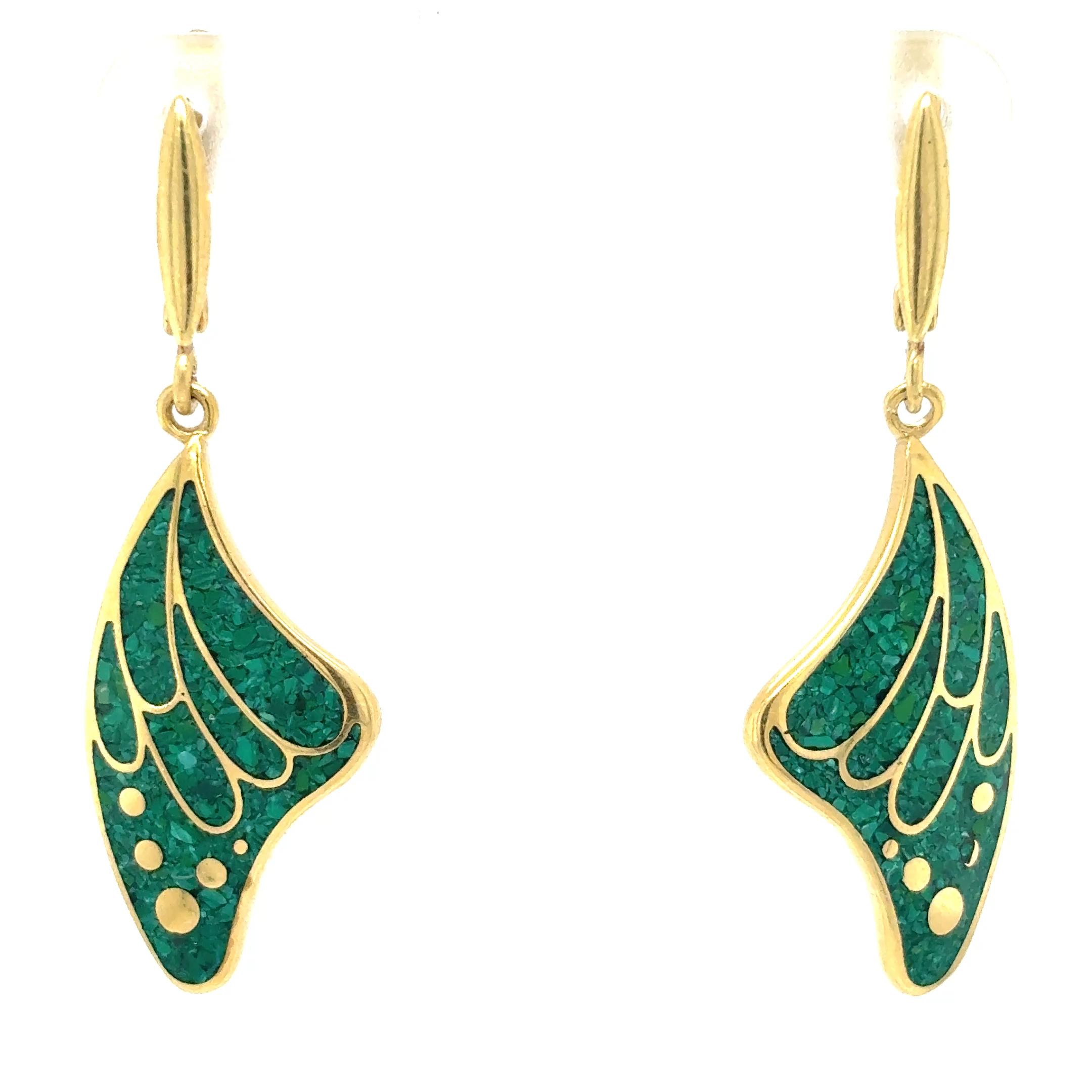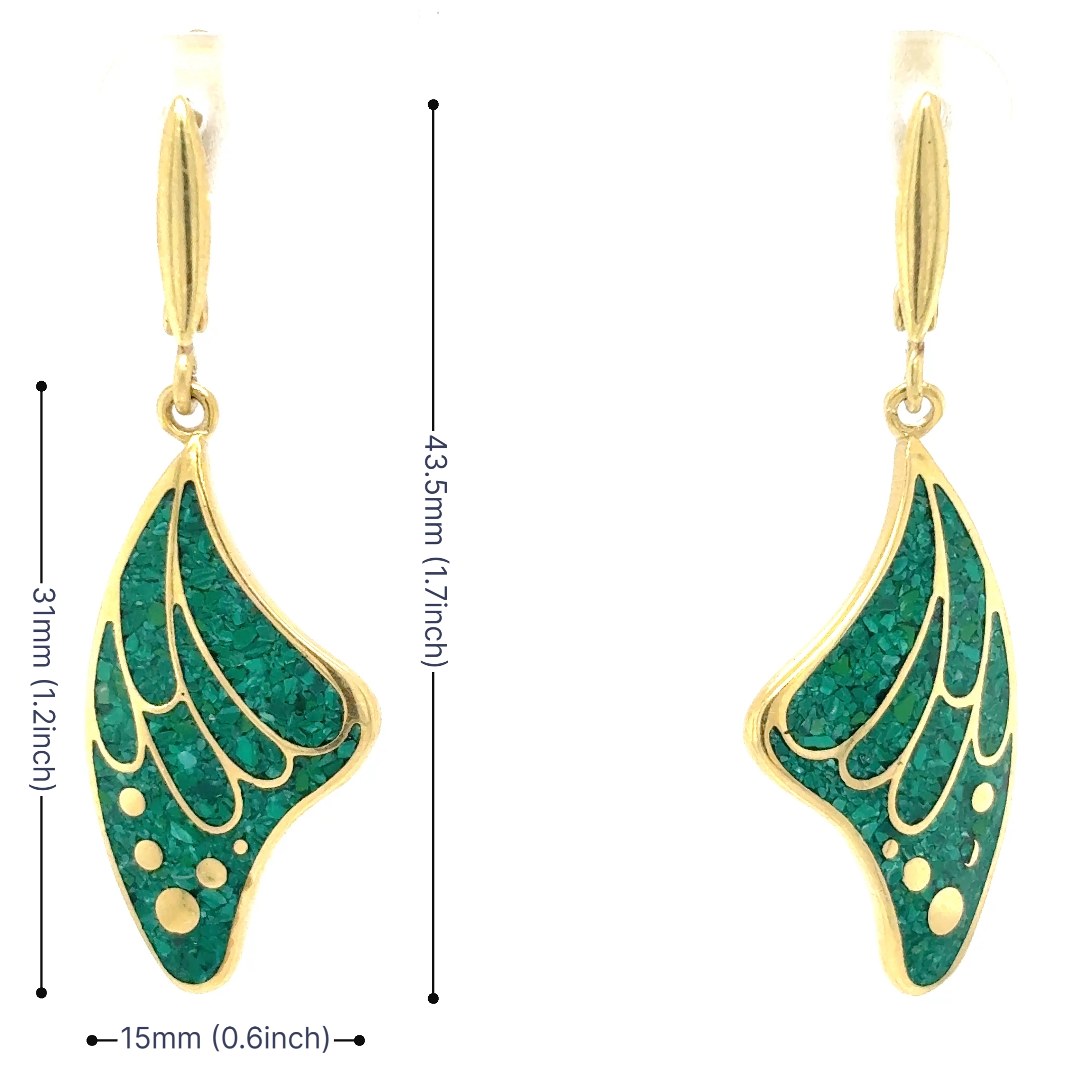 Elevate your style with these stunning handcrafted earrings, featuring a vibrant green turquoise micro mosaic inlay set within a graceful solid brass wing-shaped frame. Delicate brass filigree detailing overlays the mosaic, depicting elegant feather or wing veins, creating an inspiring interplay of color and texture.