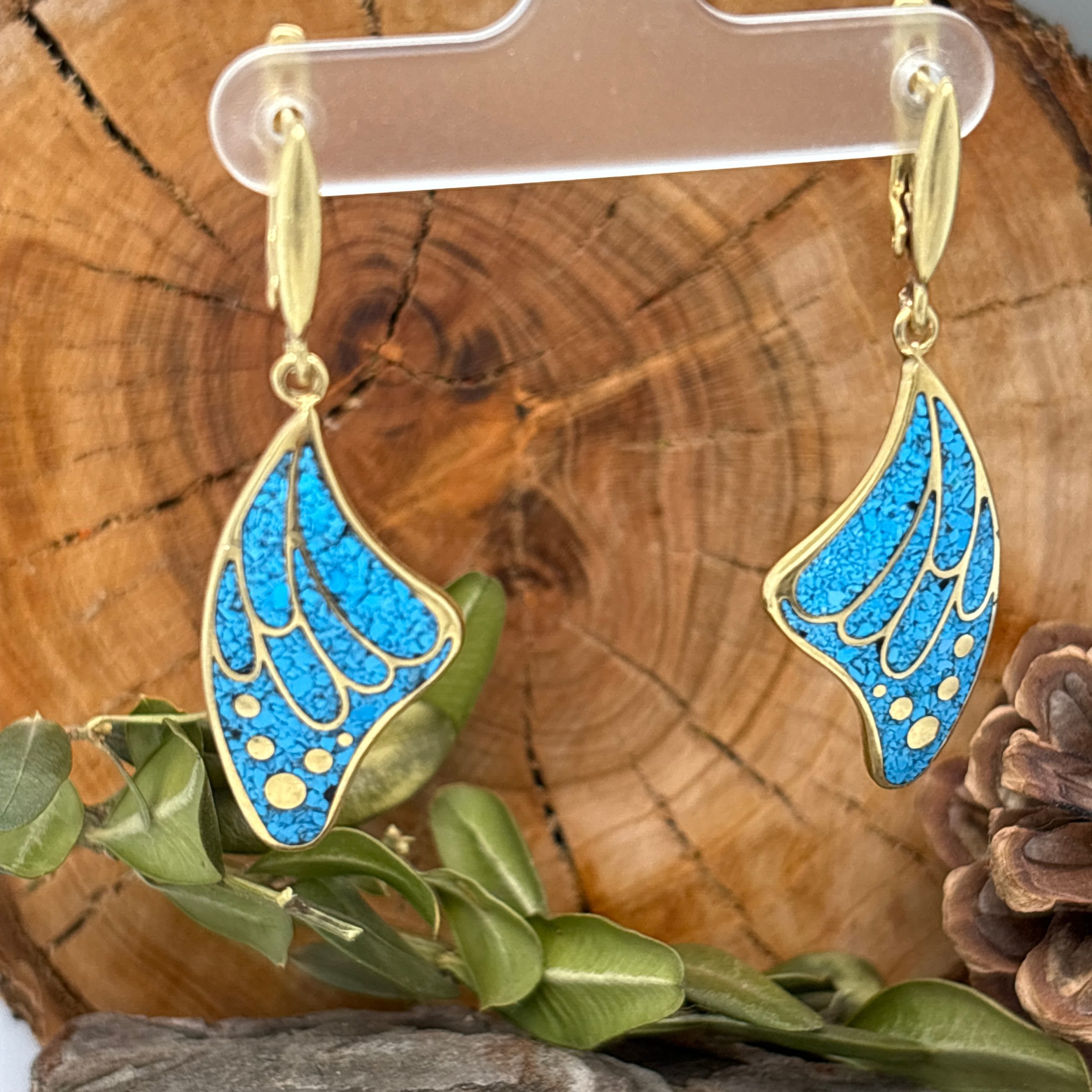 Elevate your style with these stunning handcrafted earrings, featuring a vibrant light blue turquoise micro mosaic inlay set within a graceful solid brass butterfly wing-shaped frame. Delicate brass filigree detailing overlays the mosaic, depicting elegant wing veins, creating an inspiring interplay of color and texture.