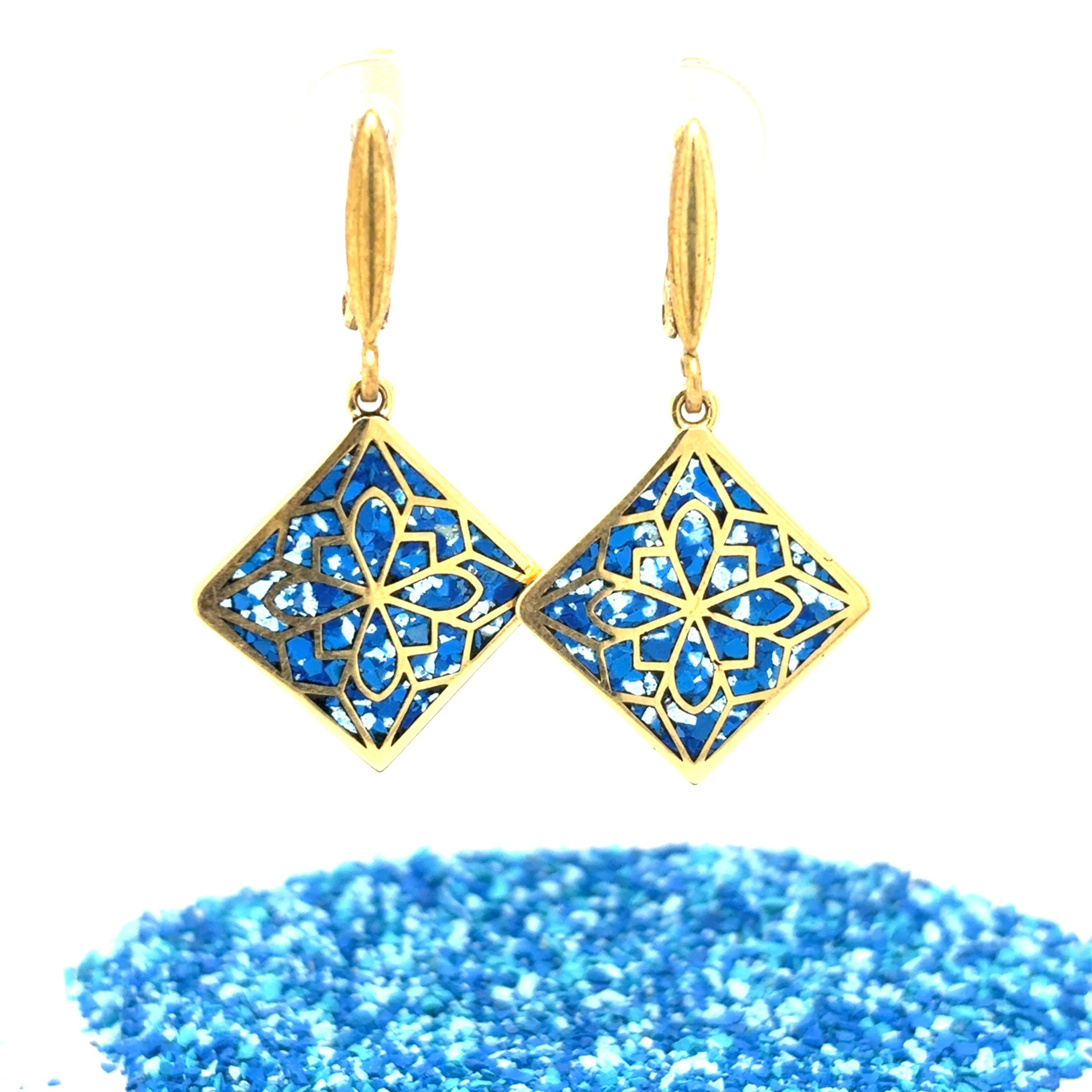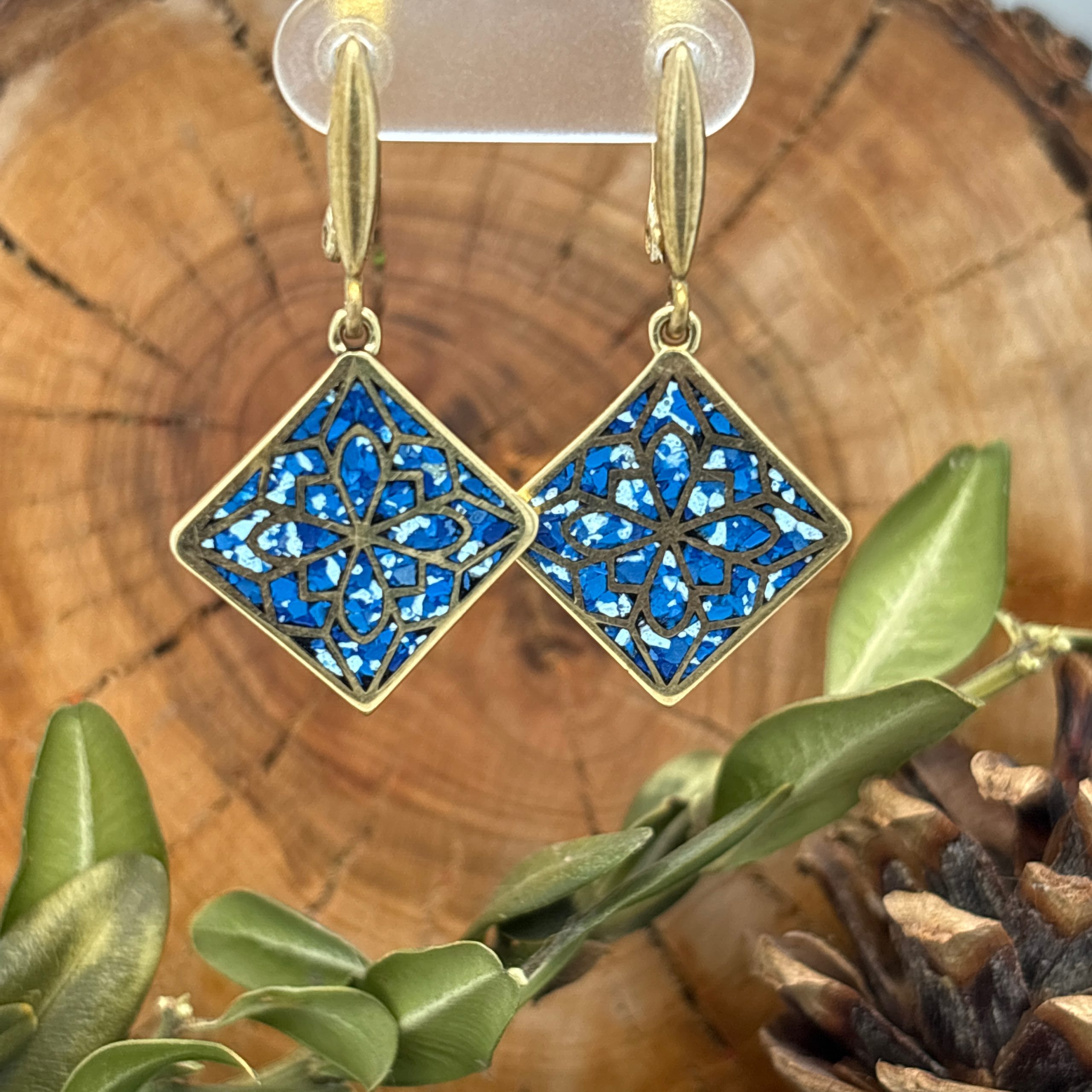 Elevate your look with these handcrafted drop earrings, featuring a vibrant blue and white turquoise micro mosaic inlay set within an elegant brass diamond/square frame. Delicate brass filigree detailing overlays the mosaic, creating an intricate geometric pattern and a captivating interplay of color and texture.