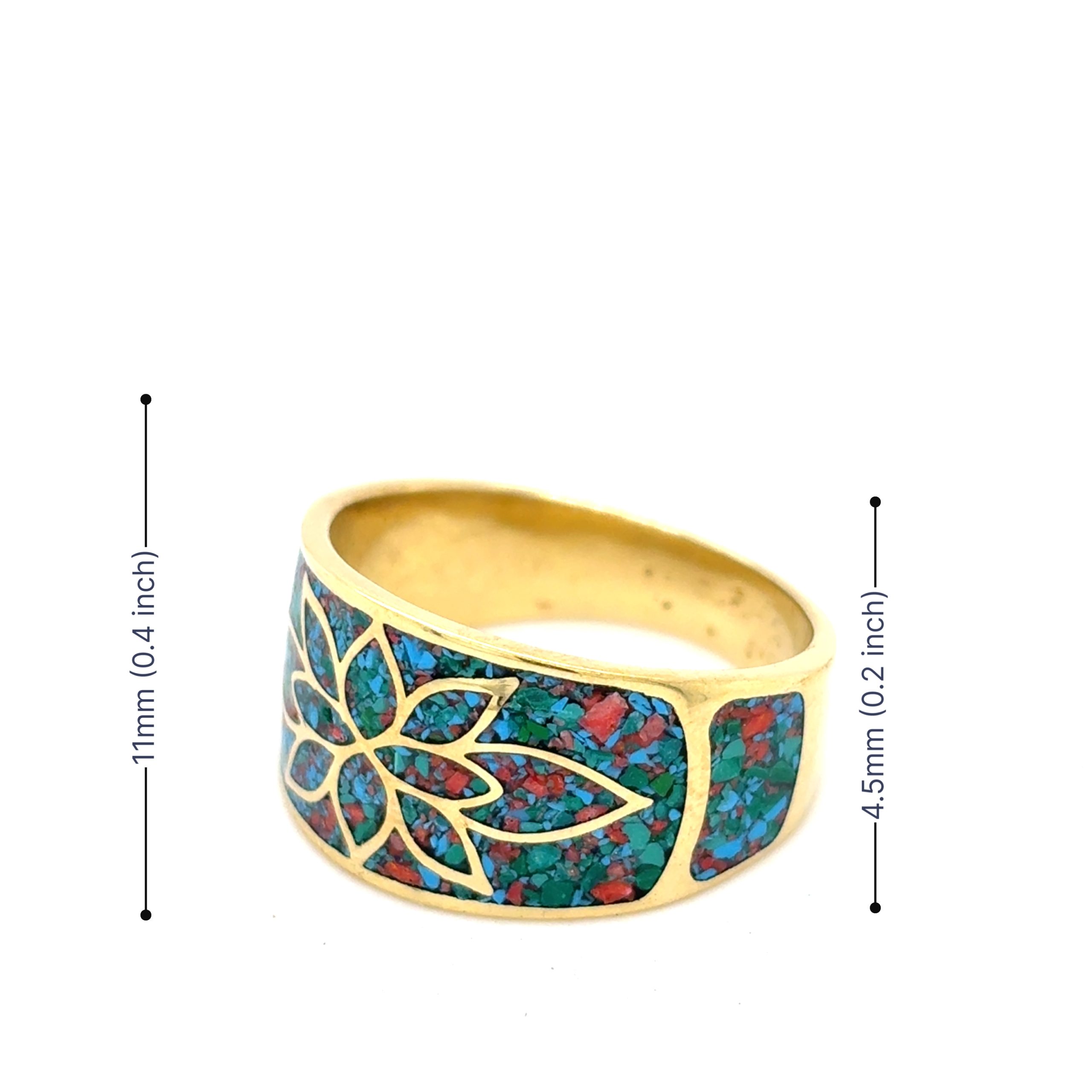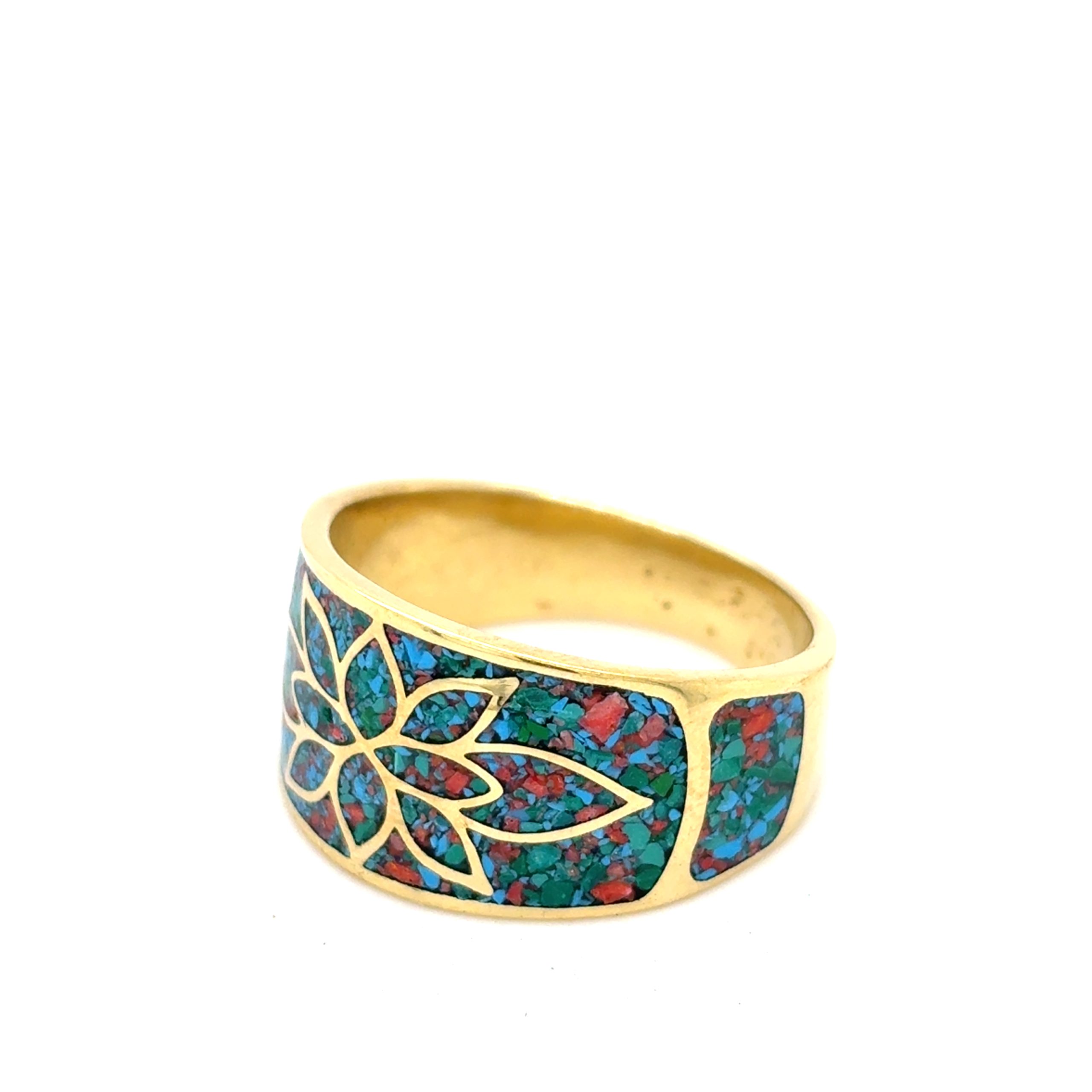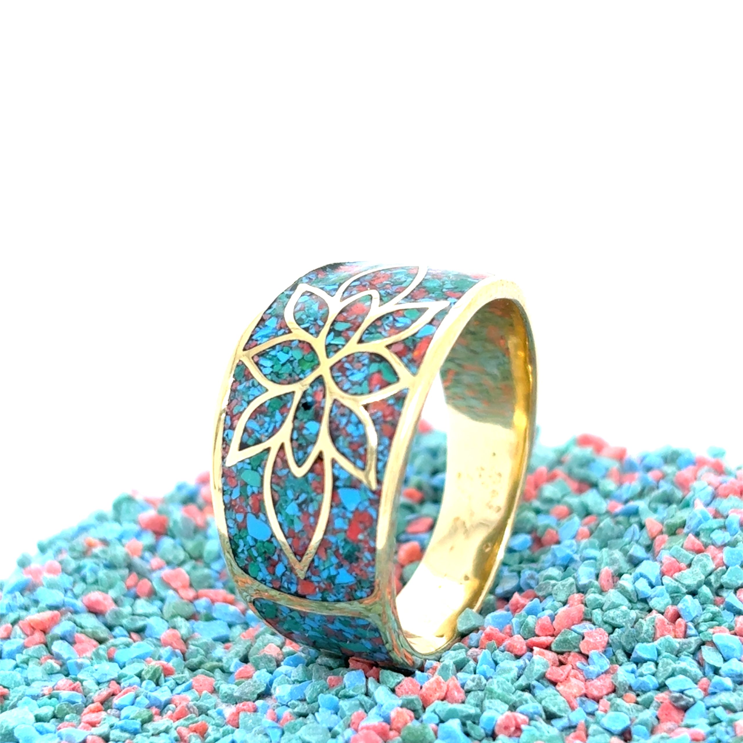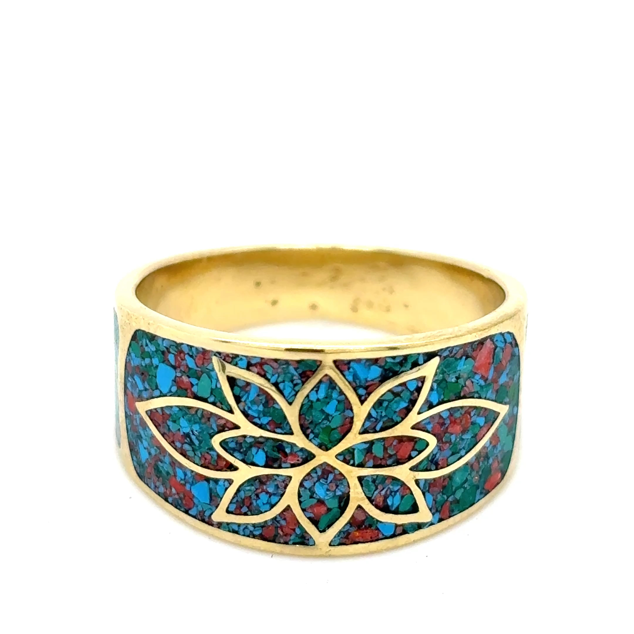 Material: Polished brass with mixed-color turquoise mosaic inlay (teal, blue, and coral-red)