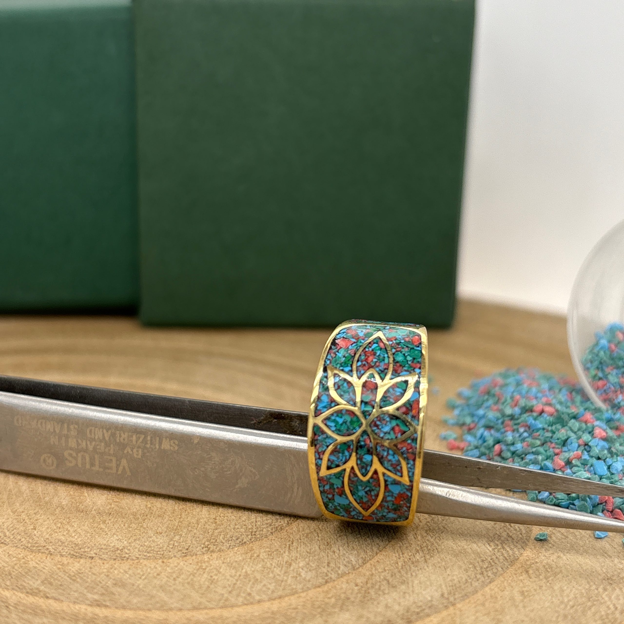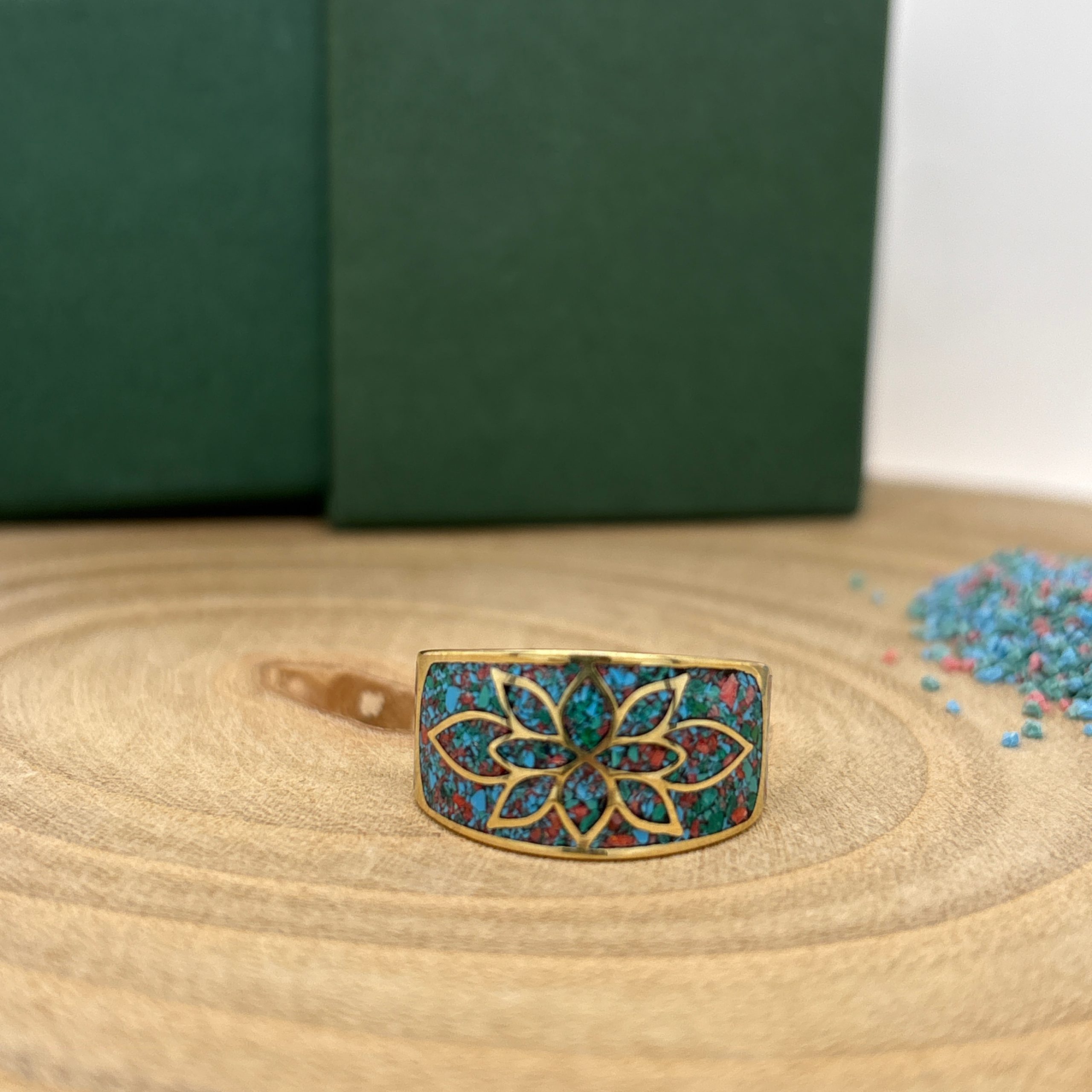 Featuring a bold, central lotus-like floral pattern set in polished brass, this design rests upon a vibrant micro-mosaic of teal and earthy red turquoise. Desert Bloom captures the resilience and striking beauty of a rare flower flourishing in a dramatic landscape. The pattern suggests vital energy and exotic beauty, evoking both ancient botanical art and the intense colors of the sunset-lit desert.