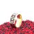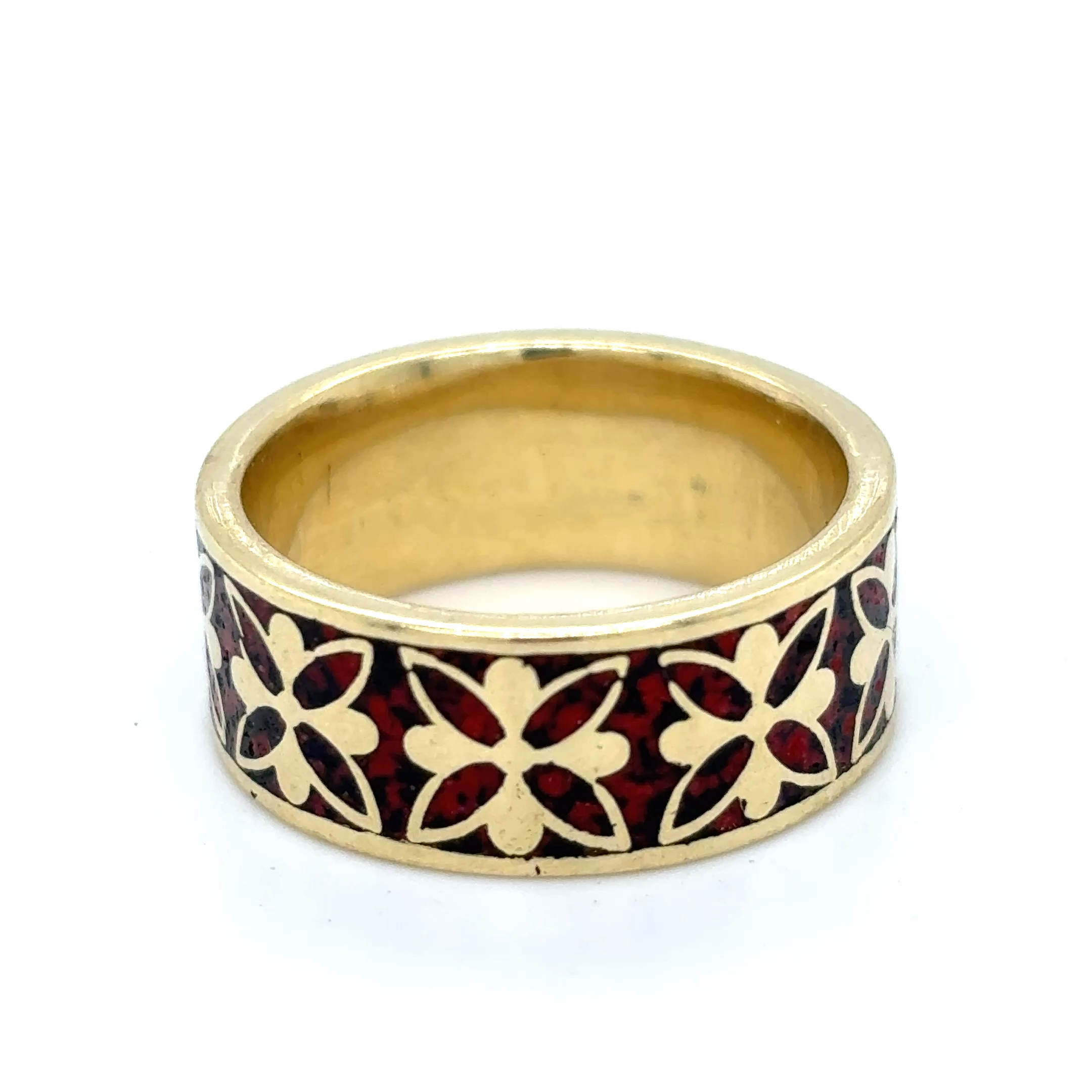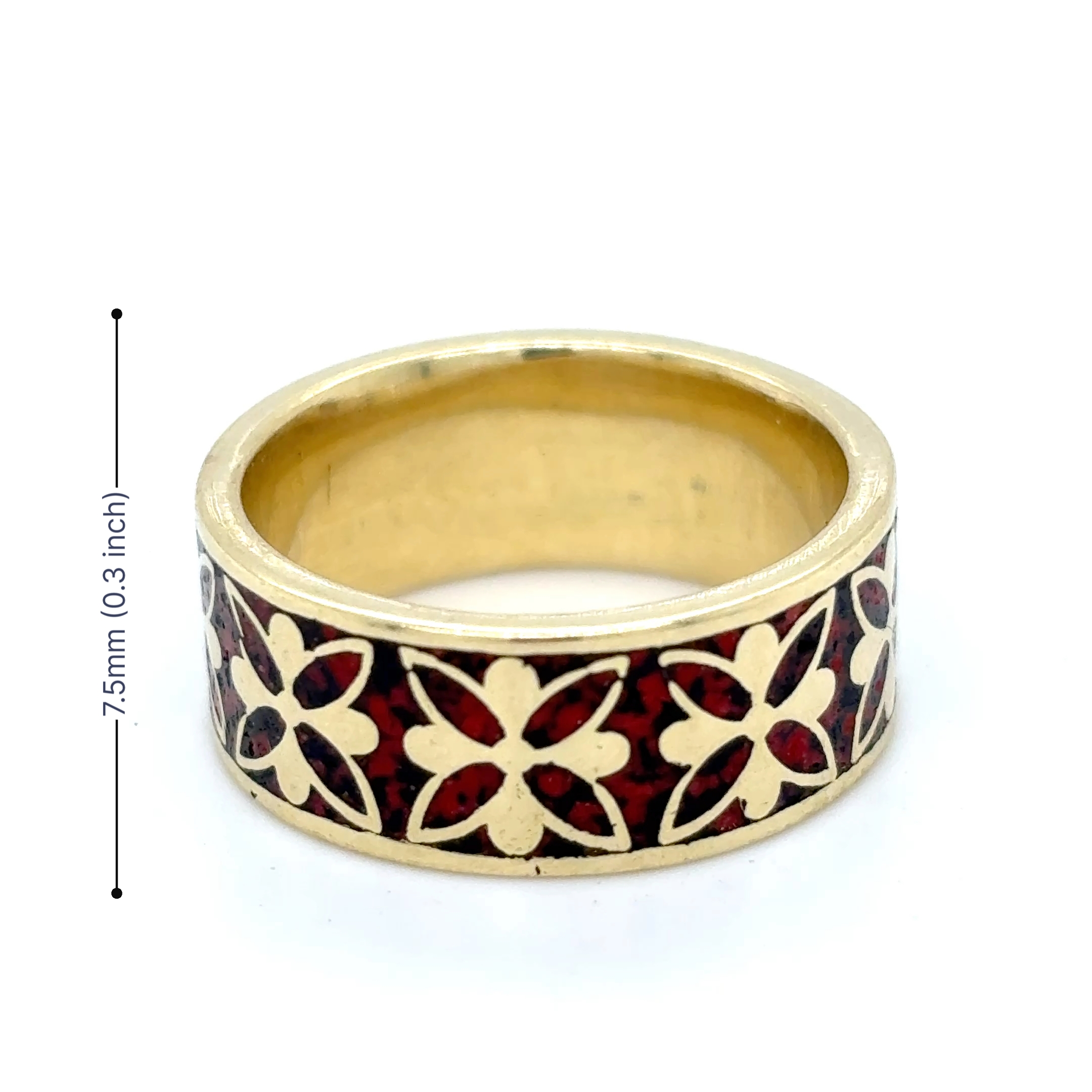 Color Palette: Rich crimson red and deep black set against warm golden brass.