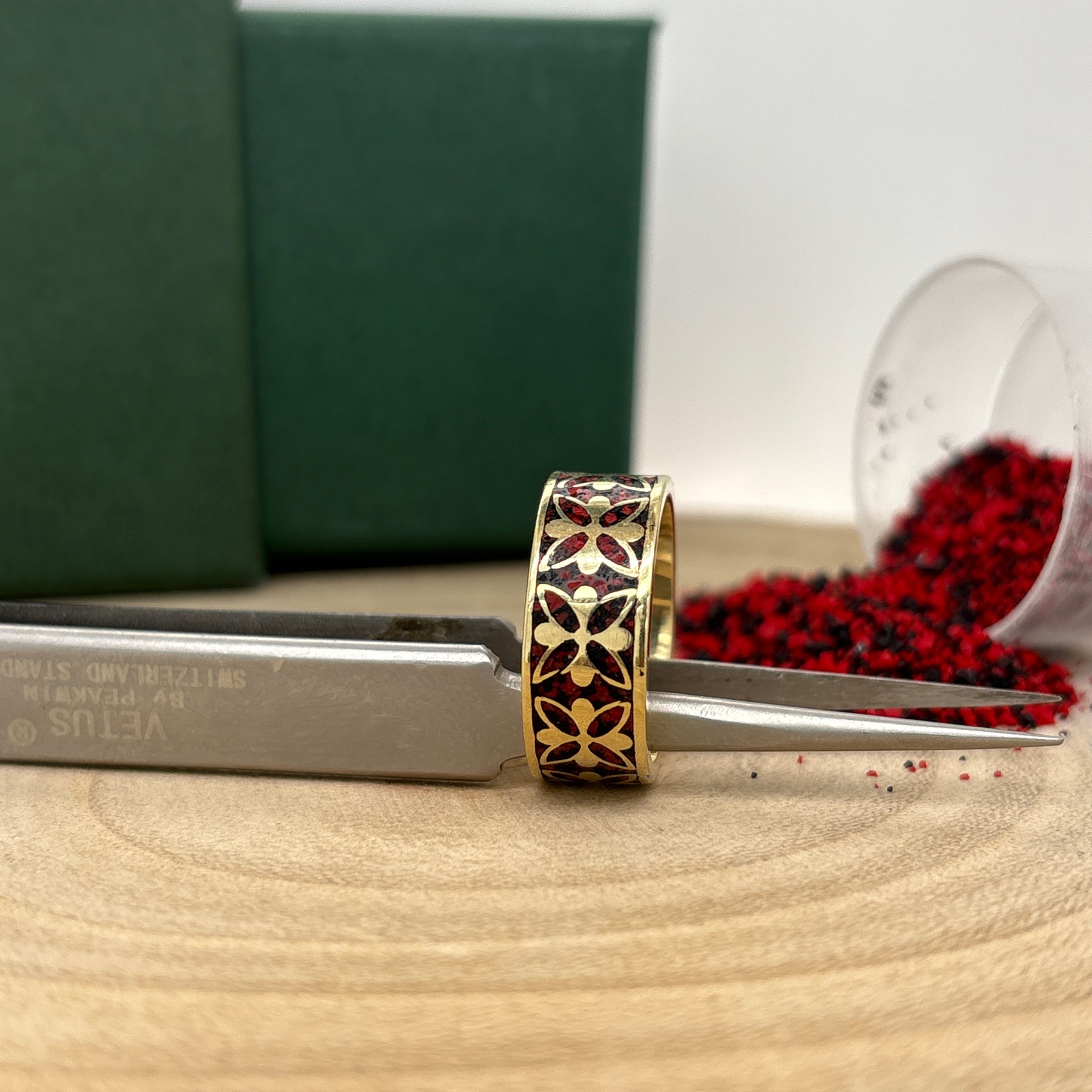 With interlocking floral forms set in vibrant red and black turquoise mosaic, Crimson Bloom conjures the intense, velvety richness of a shadowed garden, capturing timeless beauty in geometric precision. The bold pattern suggests a striking contrast and passion, evoking both classic art nouveau design and the natural elegance of a blossoming vine.
