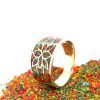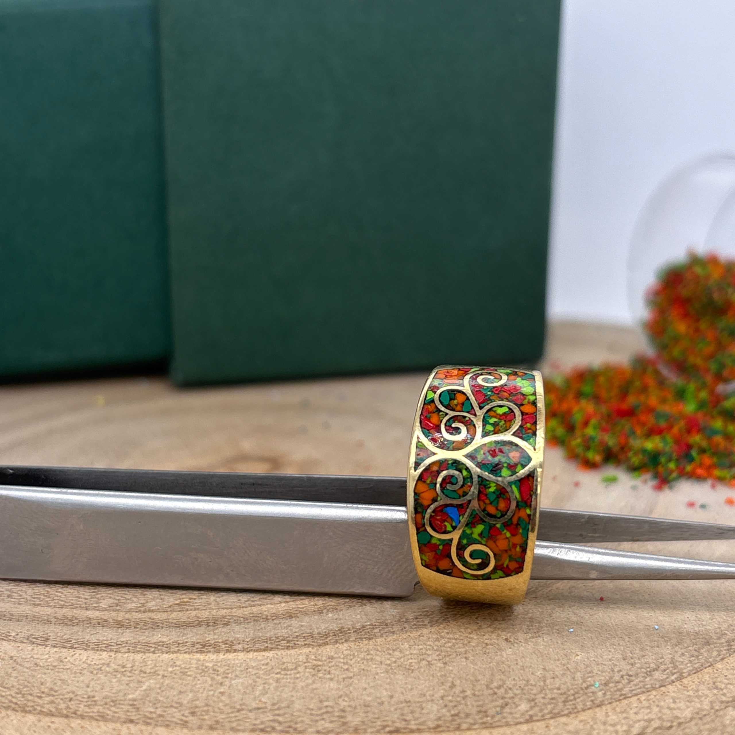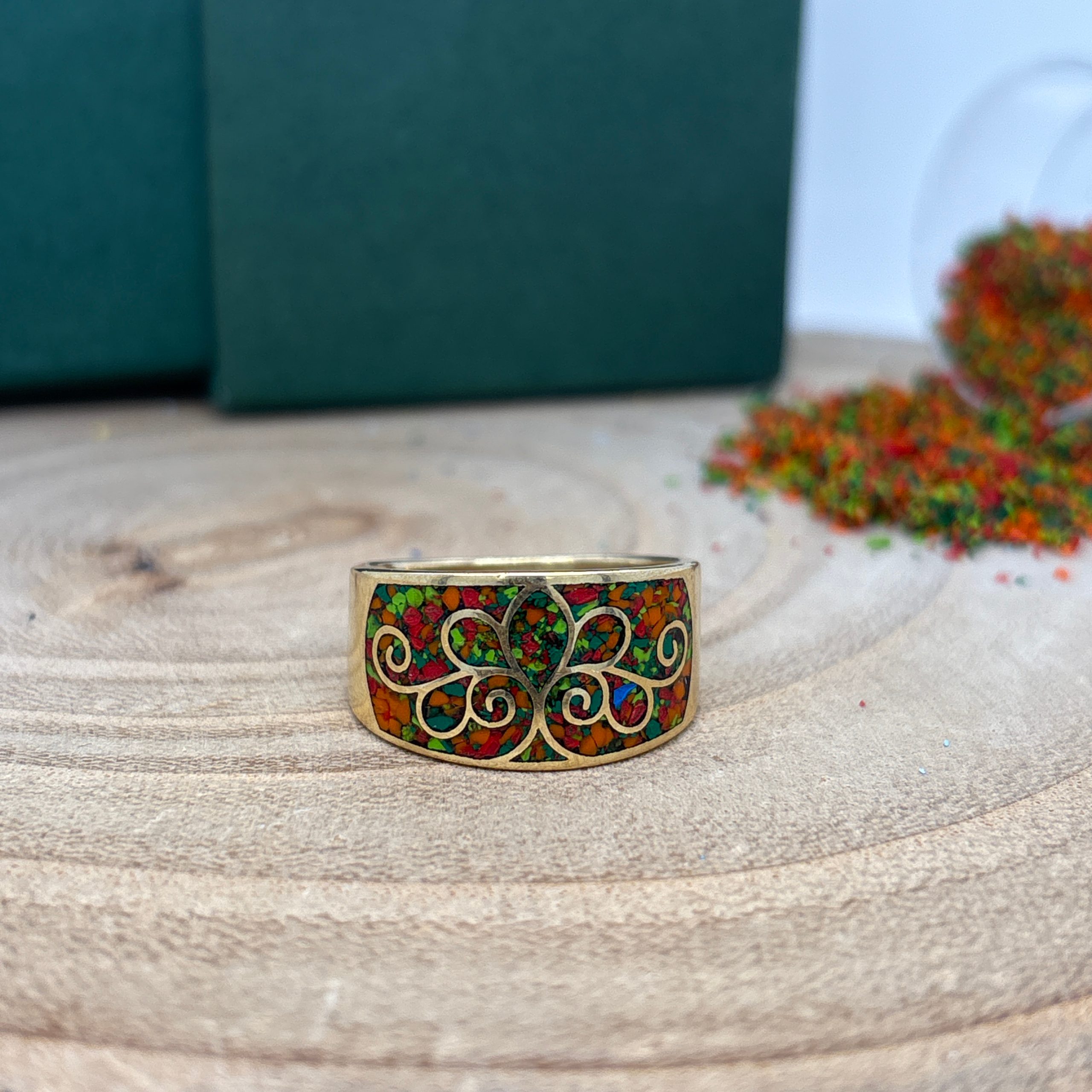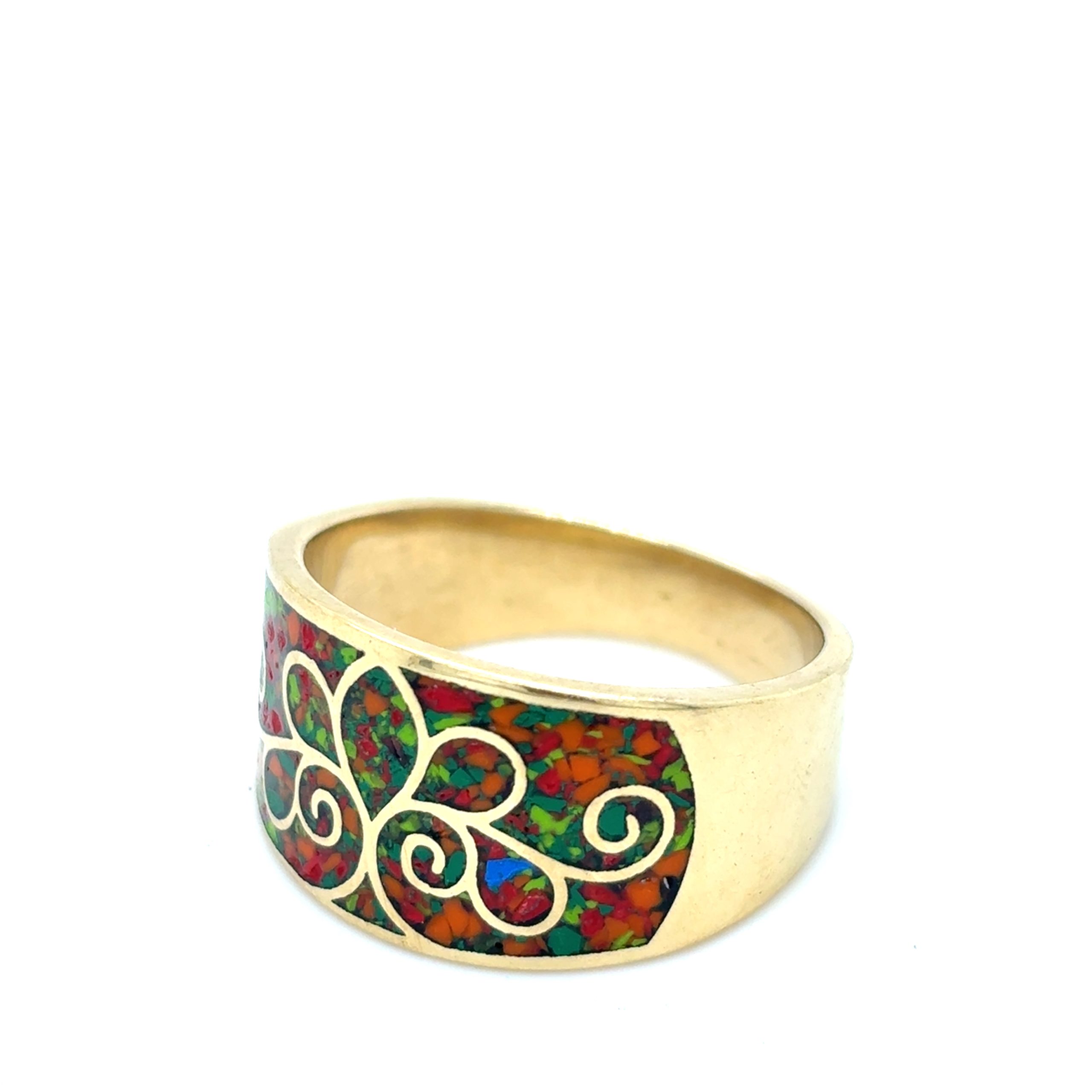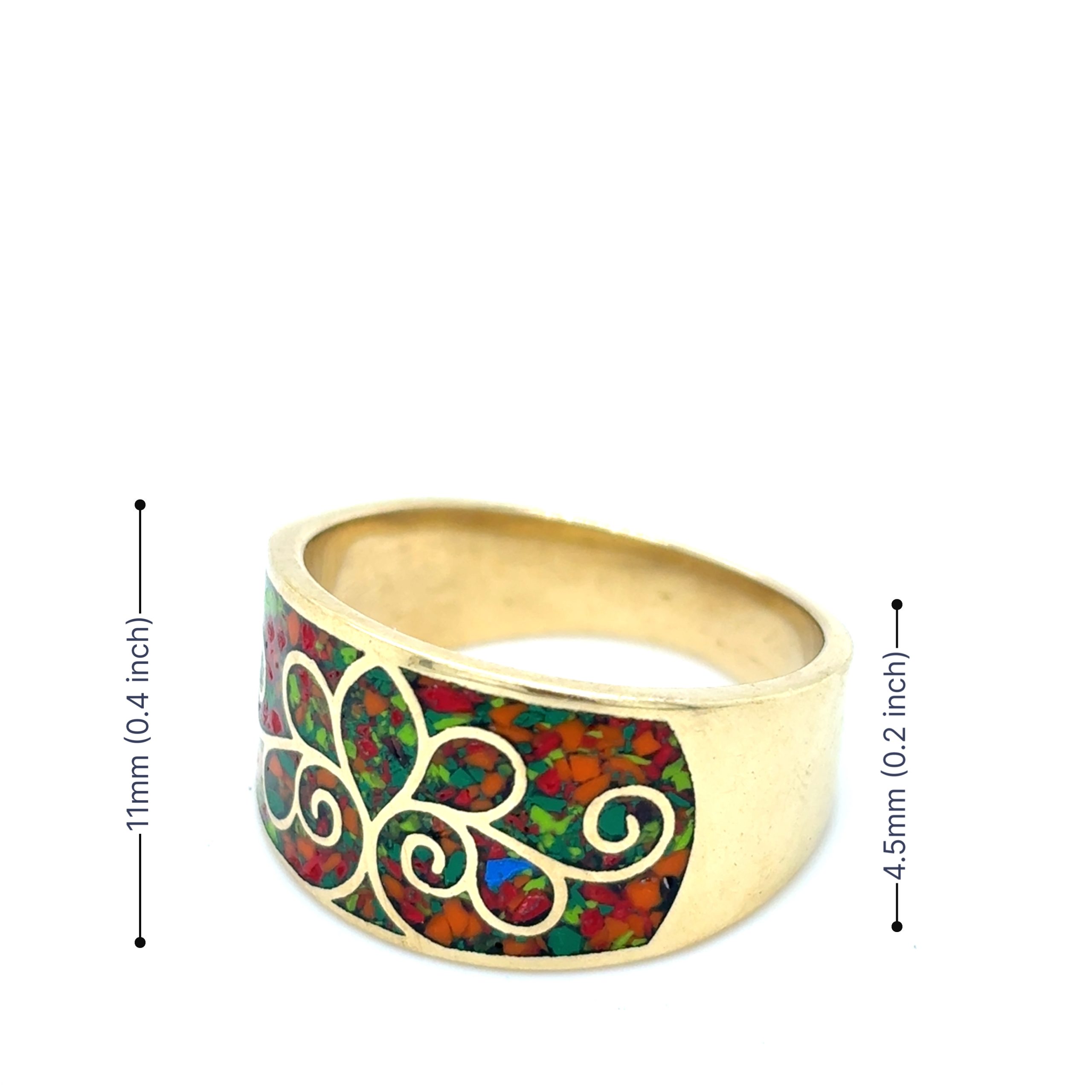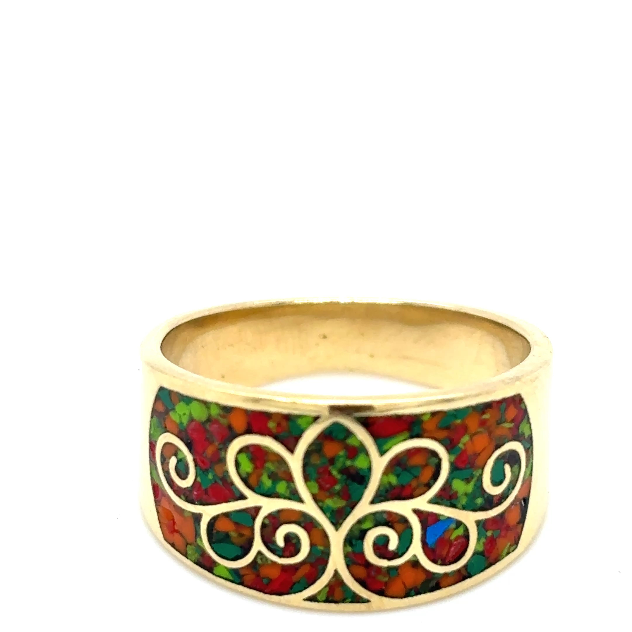 • Material: Polished brass with multi-color mosaic inlay (red, orange, green)