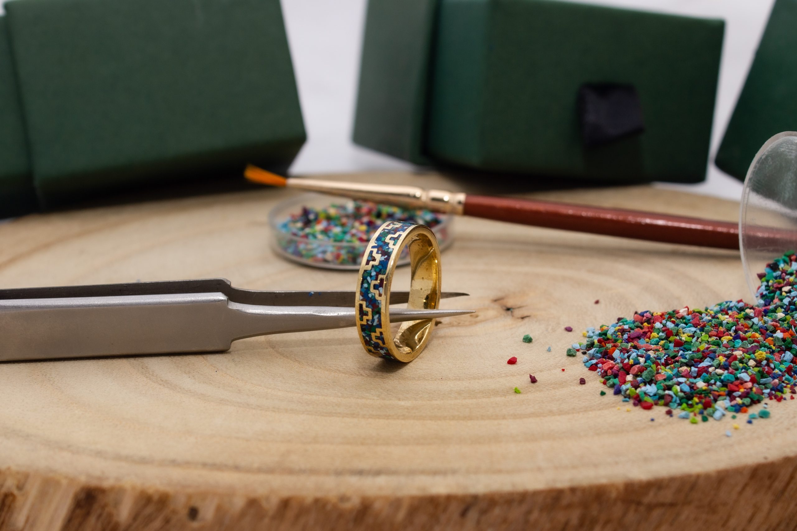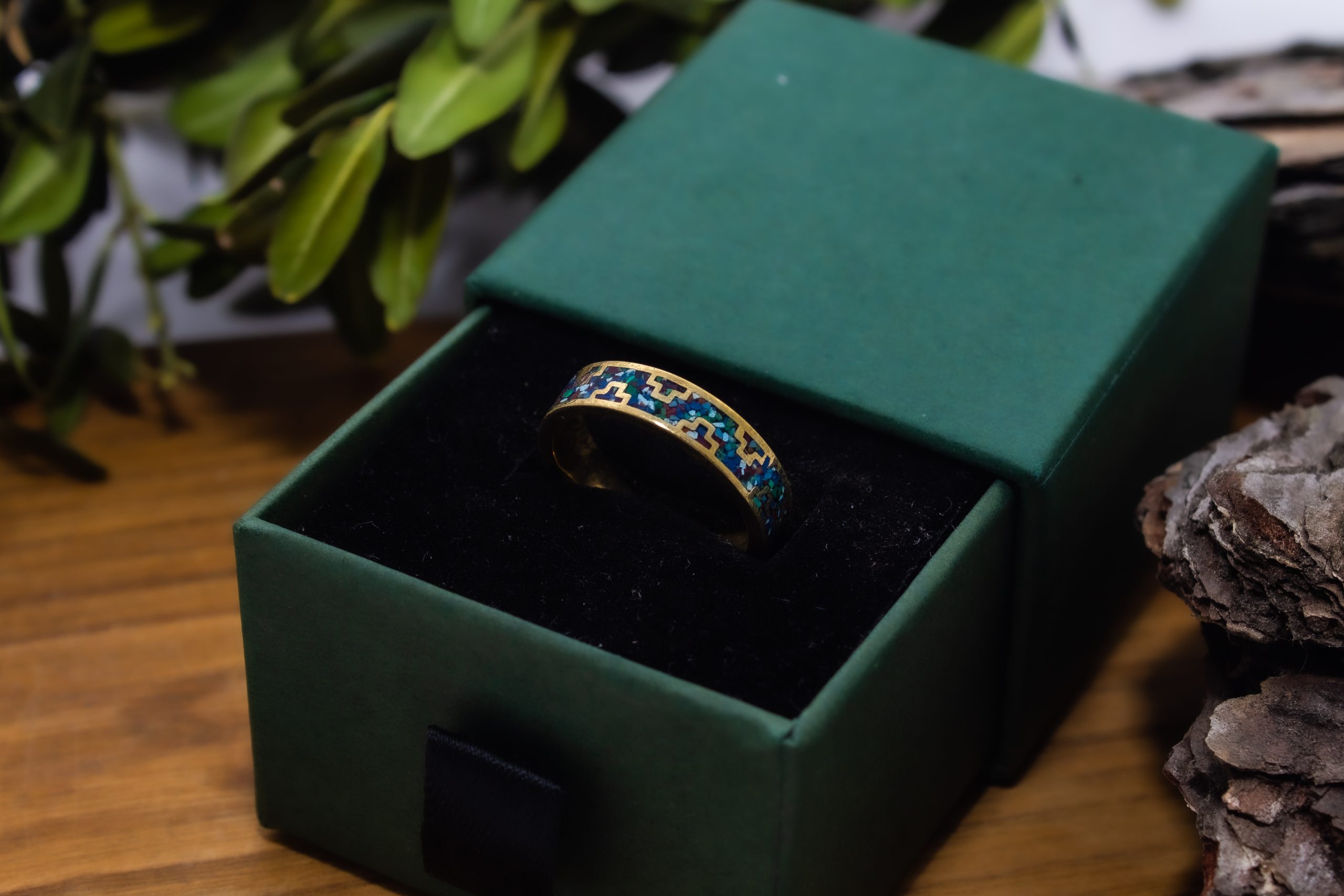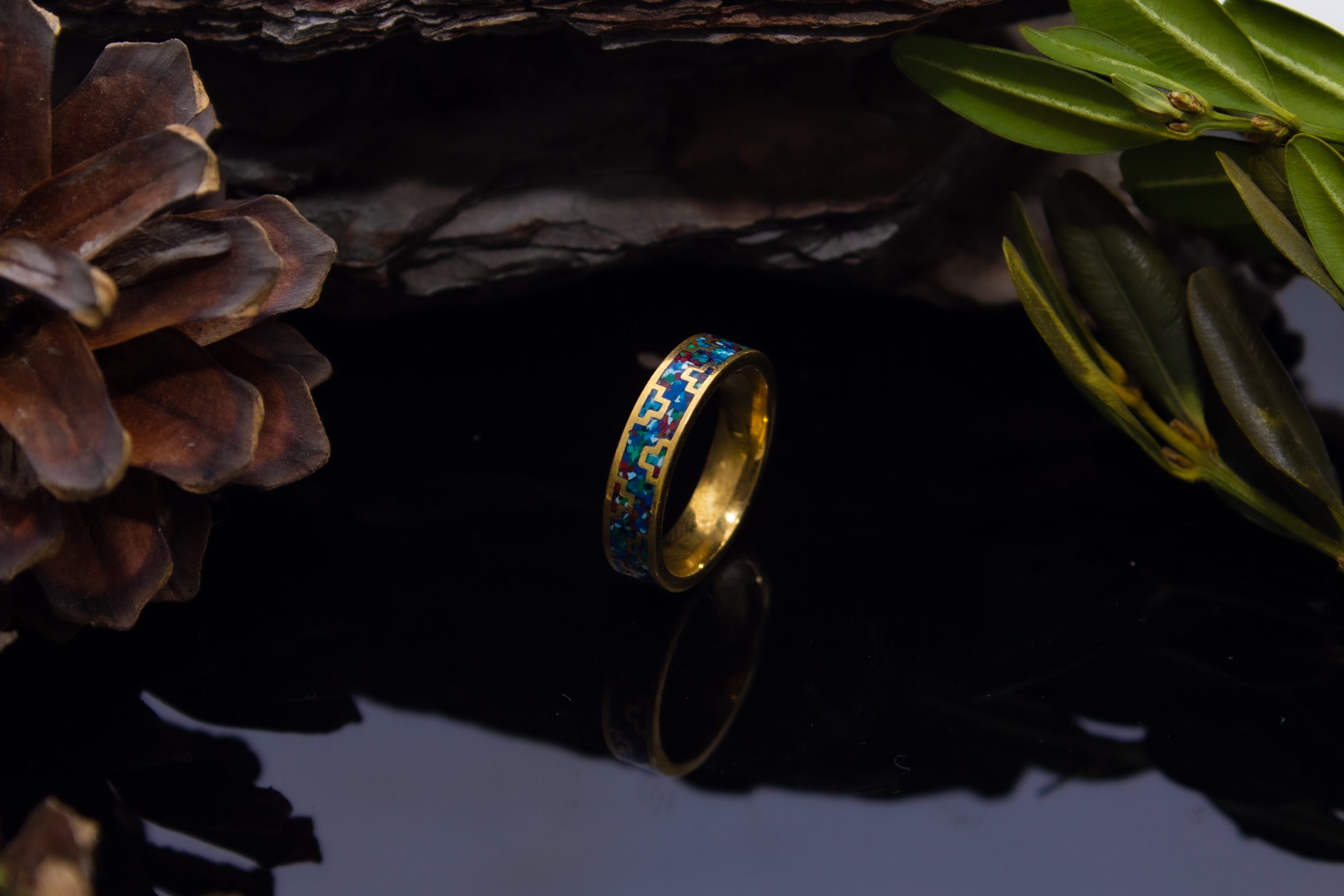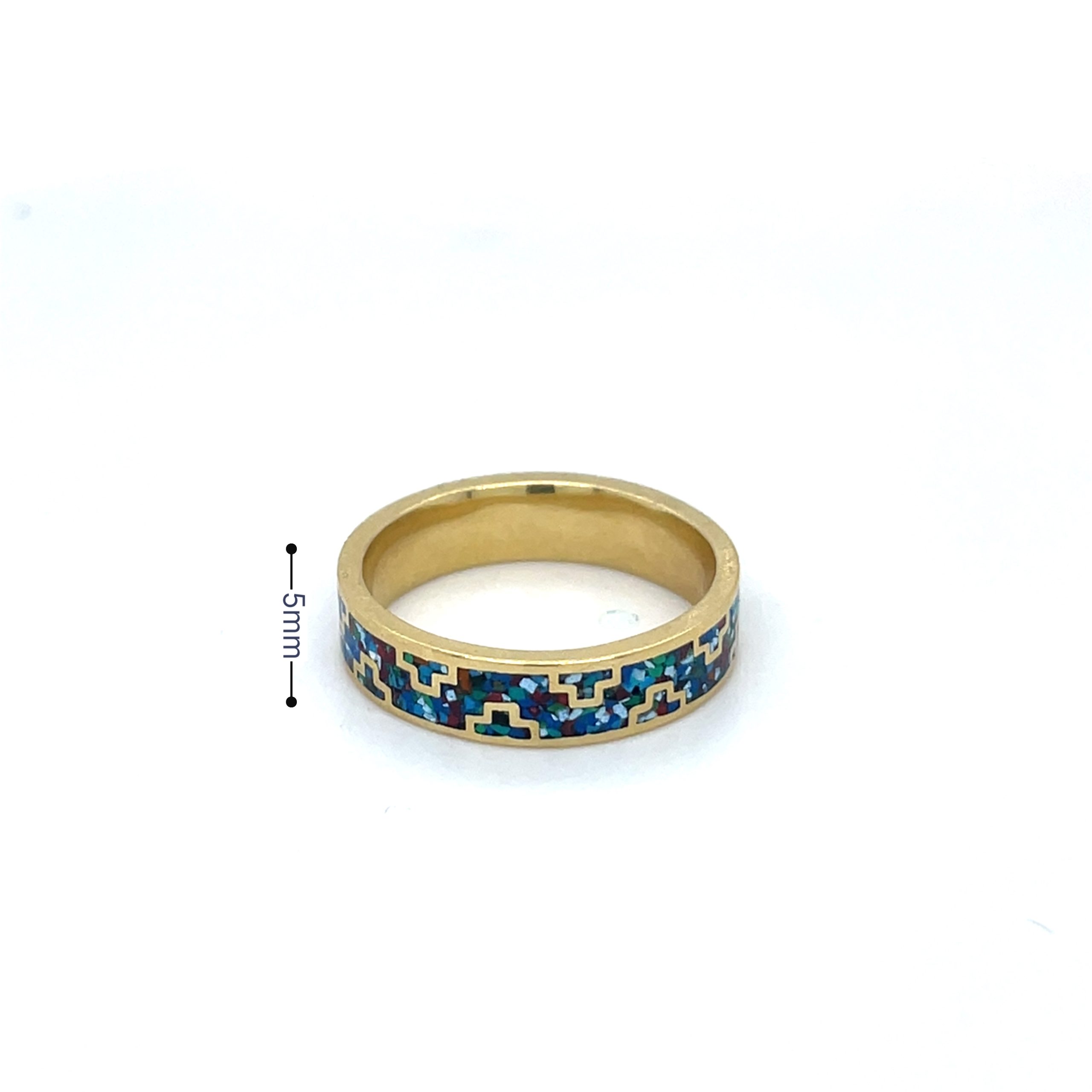 A captivating blend of intricate design and serene majesty, this ring showcases the harmonious interplay between crafted precision and the calming depth of tranquil blue. Its centerpiece—a hand-inlaid mosaic of Colorful Mix—forms a distinct interconnected pixelated or block-like path pattern, meticulously set within a frame of polished brass. The design evokes a sense of continuous connection and quiet strength, appealing to those who appreciate the beauty of systematic artistry and the tranquil allure of deep blue hues. Crafted with meticulous care and powdered stone, it speaks of elegant engineering, purposeful arrangement, and the quiet harmony found in balanced interaction. This piece represents a refined aesthetic, a keeper of serene patterns and noble design.